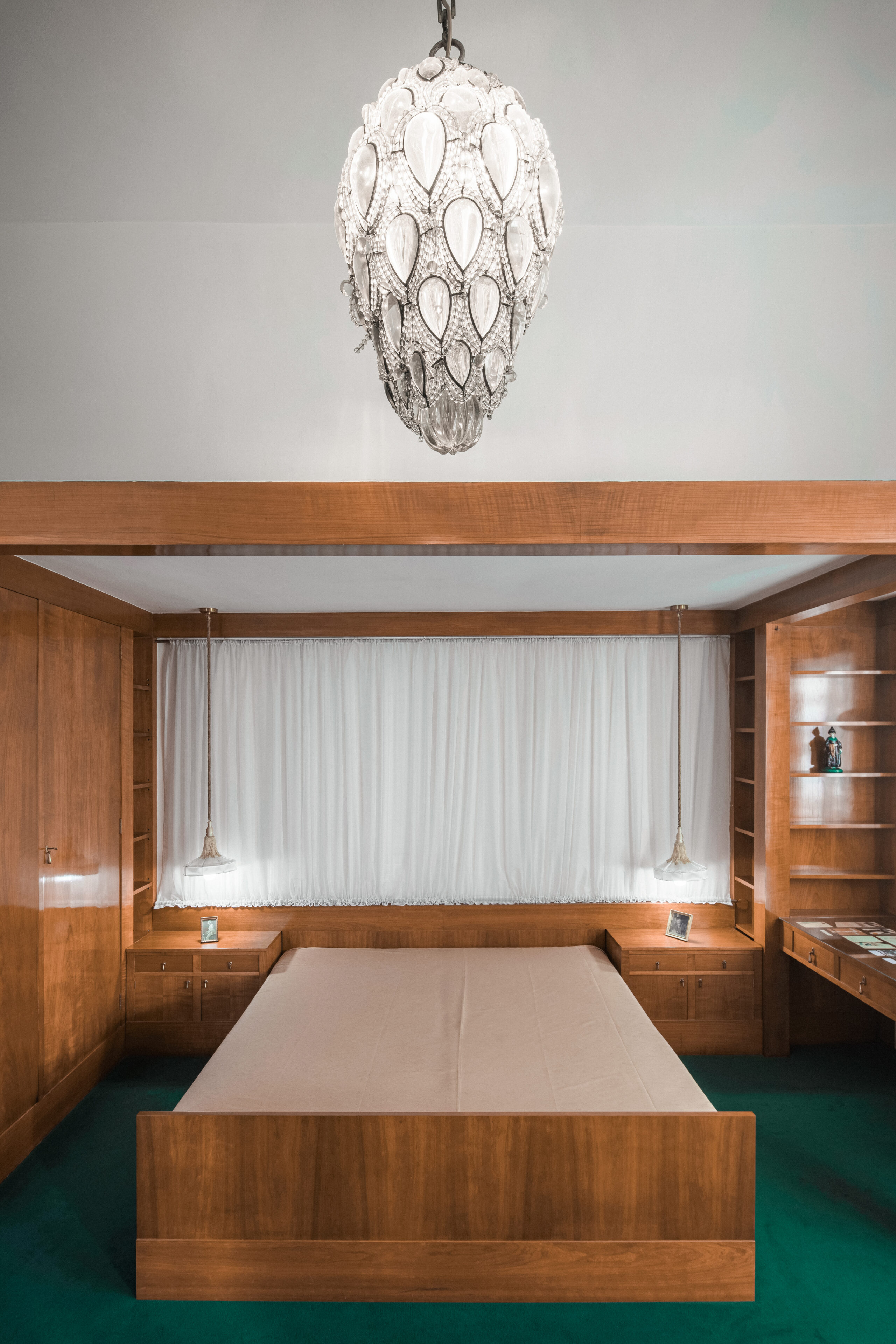 Ložnice manželů je pak řešena v teplém tónu třešňového dřeva s bílou barvou stropu s dekorativním velkým skleněným lustrem kapkového tvaru, zavěšeným uprostřed. Decentní barevnou harmonii světlého jasanového dřeva a použitých textilií vykazuje ložnice Hedviky Liebsteinové, která je důmyslně vybavena vestavěnými skříněmi a rozkládacím lůžkem, nemálo připomínajícím luxusní vlaková kupé své doby.